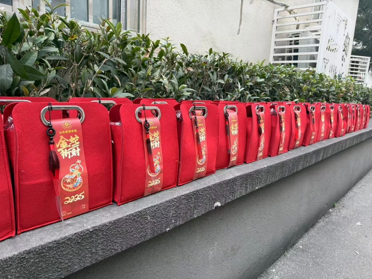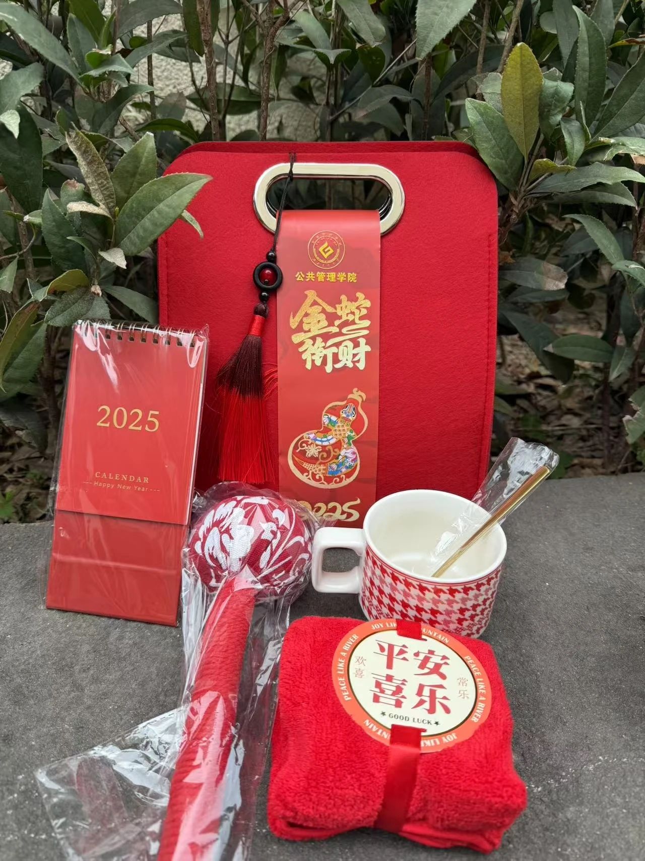 学院为每一位寒假留校的学子精心定制了新春大礼包,包含2025台历、艾草锤,平安喜乐方巾、冬日暖心水杯、金蛇衔毛毡包。火红的色彩在寒风中传递着温暖,不仅承载着学院对寒假期间留校学生的关怀,也象征着学院对学子们新年新气象的美好祝福。