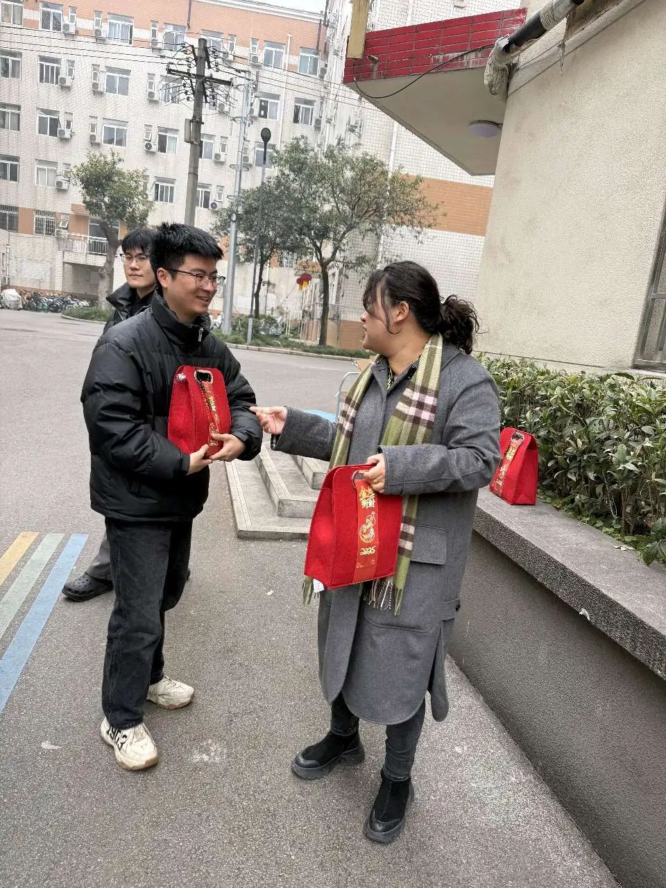 老师们为全院留校学生一一发放了慰问礼包,并代表学院祝福留校同学新春快乐,叮嘱大家留校期间注意人身和财产安全,遇到任何困难及时向辅导员和学院进行反馈。