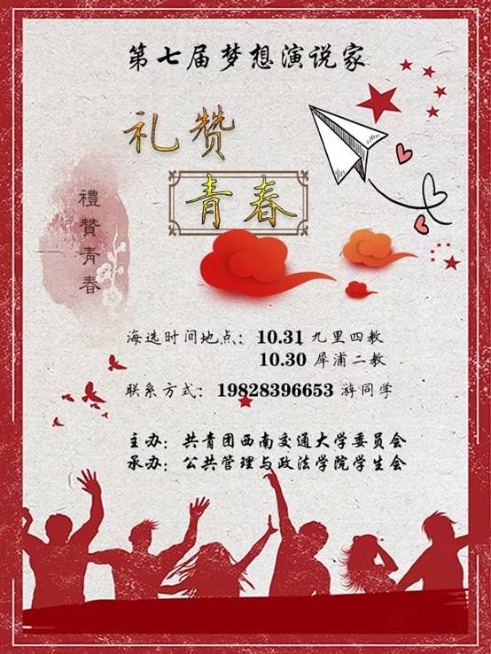 为献礼新中国成立70周年,第七届梦想演说家,如期盛大启程,本次梦想演说家围绕青春告白祖国——我和祖国共成长的主题,感悟祖国的变化与成长,畅想祖国的美好未来。将于10月30、31日晚7:00分别在犀浦、九里进行海选,海选主题“礼赞青春”。参加海选的选手围绕礼赞青春,根据自己的理解来进行三分钟的演讲。我们将在海选赛中按人数比例选出晋级选手进入于11月7日在犀浦模拟法庭初赛,初赛主题则是围绕“祖国的70岁”,为祖国生日献礼。