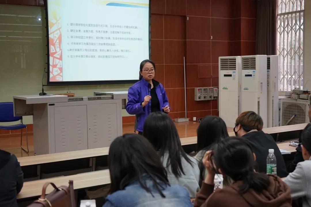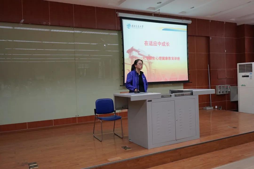 心理中心田瑞琪老师主讲的“在适应中成长--大学生心理健康教育”专题讲座于九里校区逸夫楼4104会议室顺利举行。2020级本科生辅导员许楠老师也到现场参与本次活动。