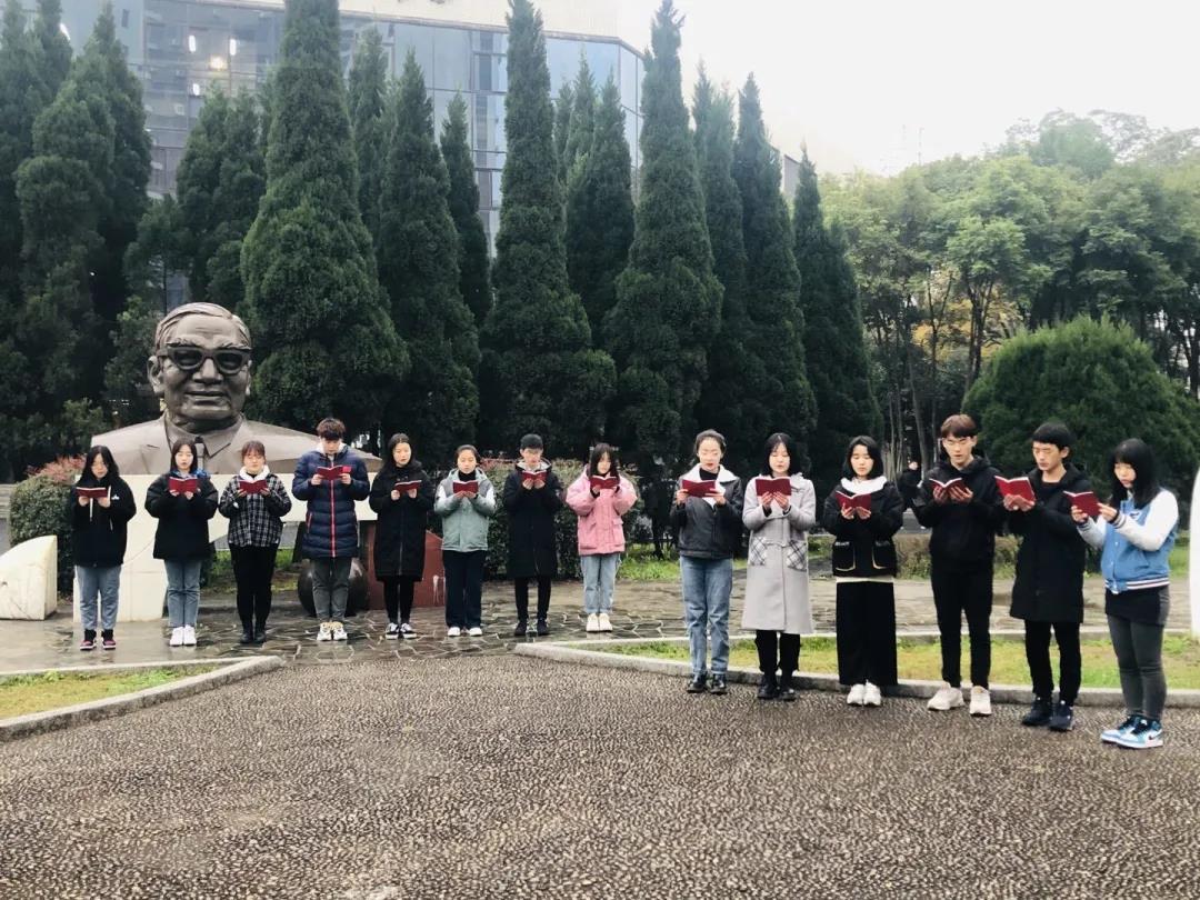 来到茅以升铜像前,同学们庄严起敬,以宪法为轴,以榜样之力,育青年之品德。同学们手中的宪法不仅仅只是一方本册,也是一代又一代国人奋斗后的产物与各位前辈学者的智慧结晶。在镜湖之畔,同学们顺着镜湖桥的拱形结构,站成两列,翩翩少年,意气勃发;于镜湖桥上,同学们迎着粼粼波光,仔细诵读宪法。在此刻,宪法精神、青年理想以及交大的未来图景都似波光那般明亮动人。