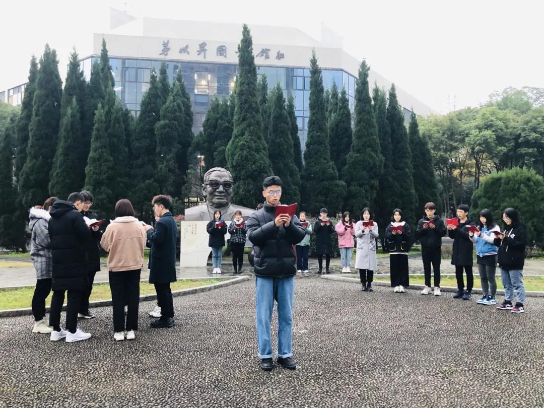 清晨,阳光一缕缕扩散,尽管寒风凛冽,也阻挡不住同学们诵读的热情。立于“聚与散”之前,同学们手捧宪法,严肃认真,整齐列队,齐声诵读。朗诵声声声入耳,条条款款都是心血结晶。清脆而整齐的诵读声伴随阳光一起落到“聚与散”雕塑上,历经思想洗礼的新时代宪法精神与经过交大百年的岁月沉淀下来的交大精神交汇、融合,共同沐浴着交大学子的心灵。