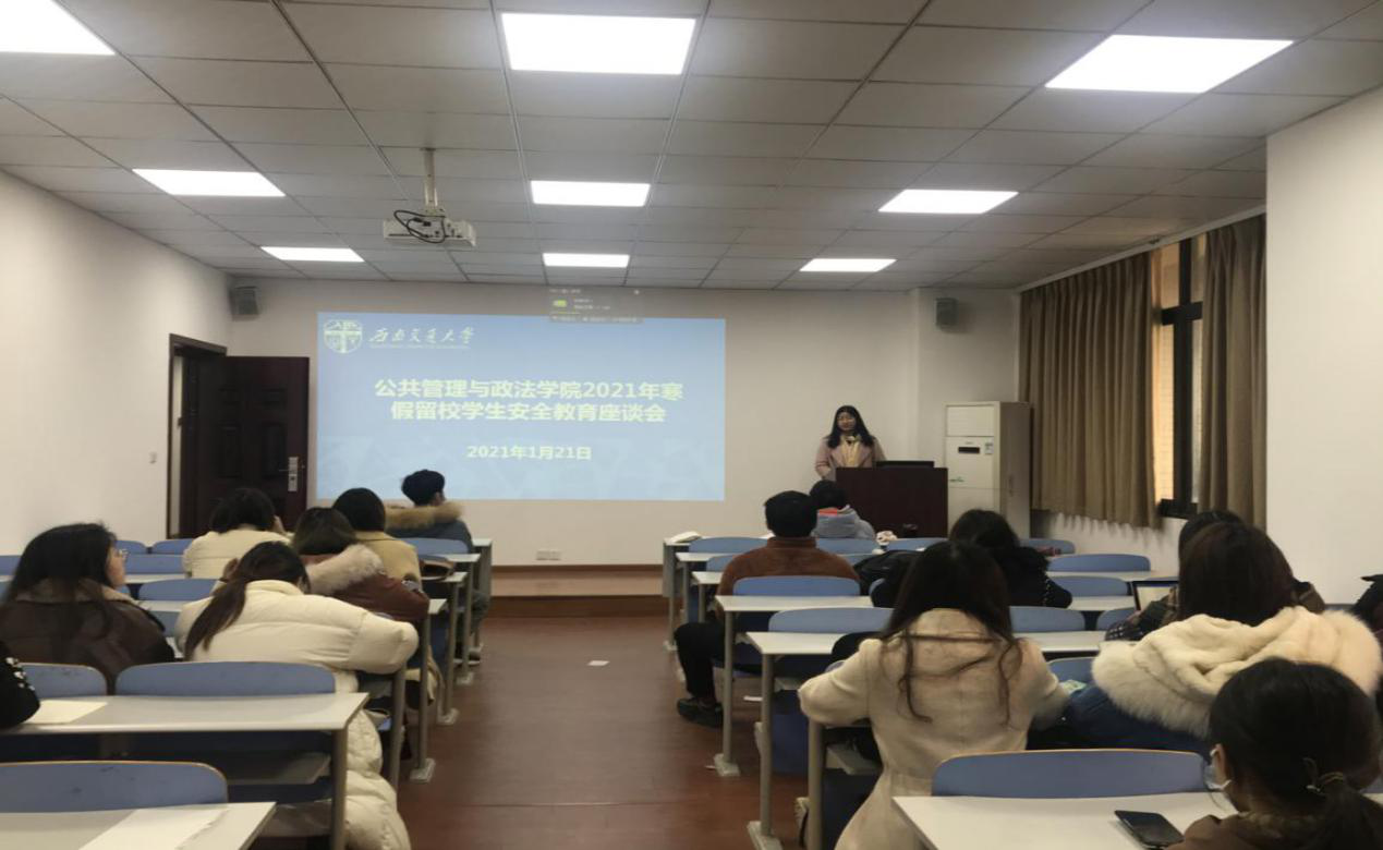 为了解学生寒假动态,做好寒假留校安全教育,保障学生留校安全,公共管理与政法学院院学工组于2021年1月21日在1105会议室召开了寒假留校学生安全教育座谈会。学院党委副书记、学工组组长余小英老师、学工组副组长薛婧老师、辅导员莫太林老师和许楠老师以及全体寒假留校同学出席会议。