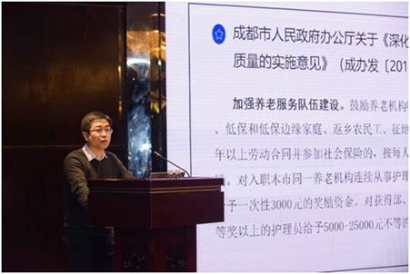 老龄科学研究院在成都养老服务相关领域做出的贡献表示称赞,并对其积极推动组建“成都养老人才学院暨成渝城市群康养医养高端智库”表示大力支持。期间成都市民政局养老服务处处长杨运江就《成民发〔2019〕32号文》进行了政策解读,旨在推动建立养老服务褒扬机制,争取把养老护理员作为养老服务先进个人评比达标表彰项目,同时宣传贯彻了《养老护理员国家职业技能标准(2019年版)》,旨在打通养老护理员职业晋升通道,加快培养高技能人才,让养老护理员的劳动创造和社会价值在全社会得到尊重和重视。